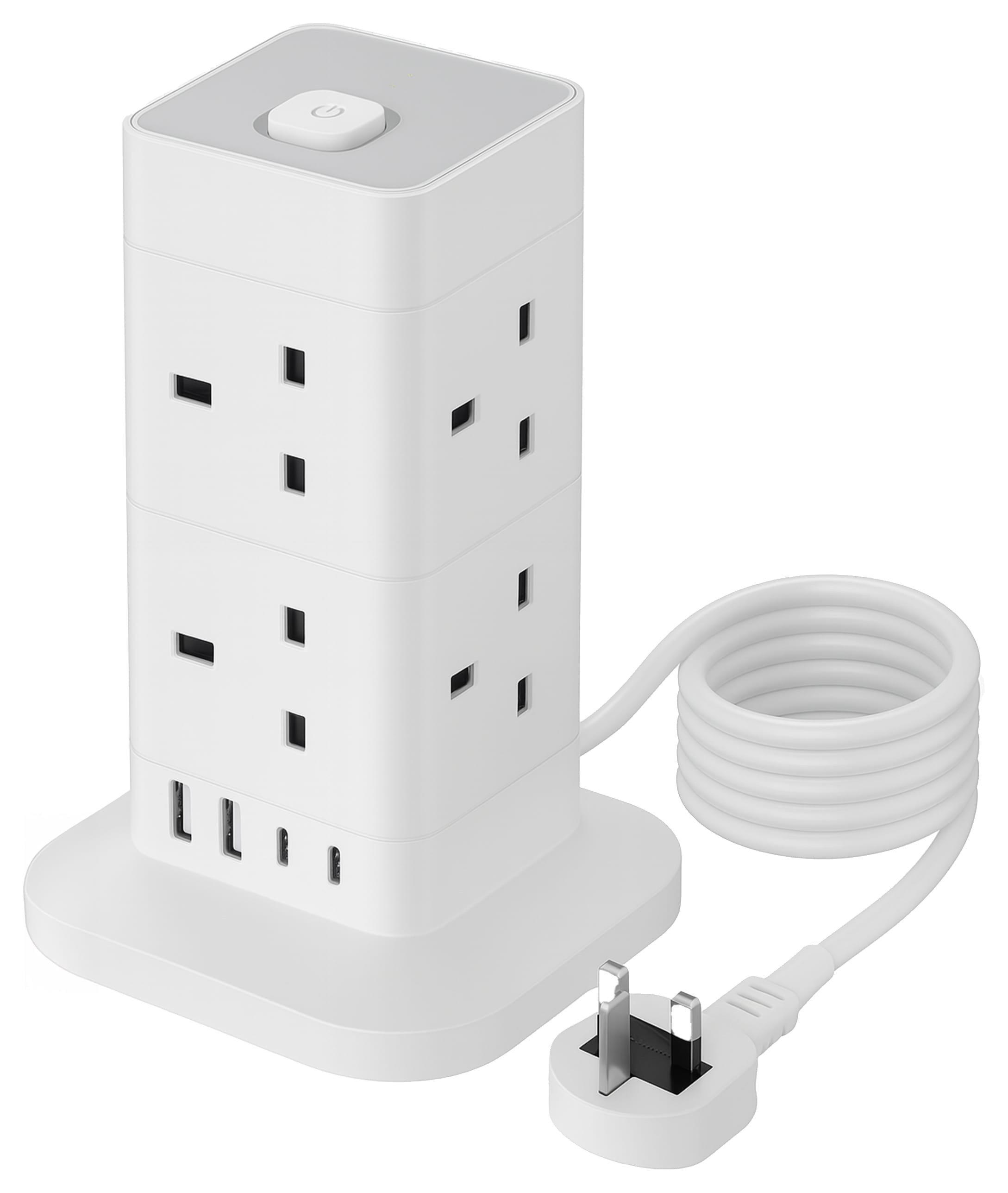 The TCP 8 AC Socket Tower Cube Extension Lead is a sleek and space-saving vertical power solution designed for modern homes and workspaces. Featuring 8 UK AC sockets, 2 USB-A ports, and 2 USB-C ports, it allows you to power multiple devices simultaneously without clutter. The 1.8-meter cable provides flexible placement, while the compact tower design ensures all ports are easily accessible. An integrated on/off switch gives you quick control over power usage, making this extension lead a smart addition to any desk, bedside, or entertainment setup.