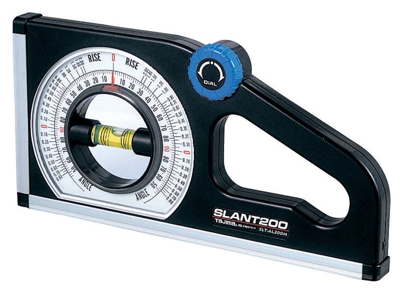 The Tajima Slant Angle Meter with magnet and aluminium frame has a protractor slant 100/200°. For convenient one handed measurements and with a measuring range of 130°-0-130°. It is a rotating dual scale protractor with easy read magnification vial and a magnetic aluminium frame for durability.