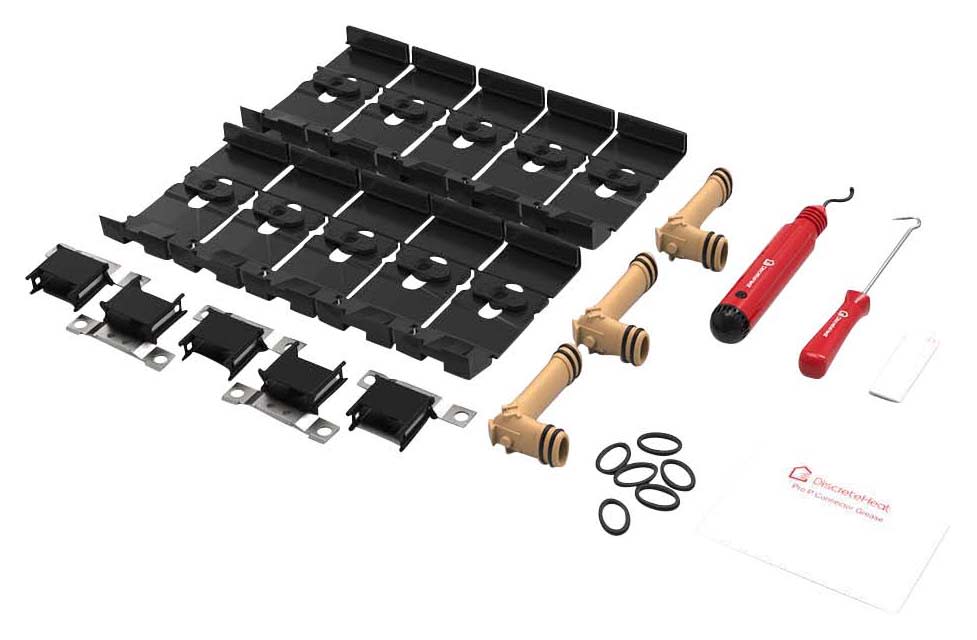 The ThermaSkirt Installation and Spare Parts Kit is a recommended inclusion for every ThermaSkirt installation, providing both an emergency spares kit and some of the vital tools required for the process. This kit contains: 1 x ThermaSkirt deburring tool, 1 x 90° oval to oval elbow, 3 x stainless steel retainer clip, 5 x replacement connector o-rings, 1 x silicone grease assembly sachet, 20 x wall mounting brackets and 1 x ThermaSkirt cover pick tool.