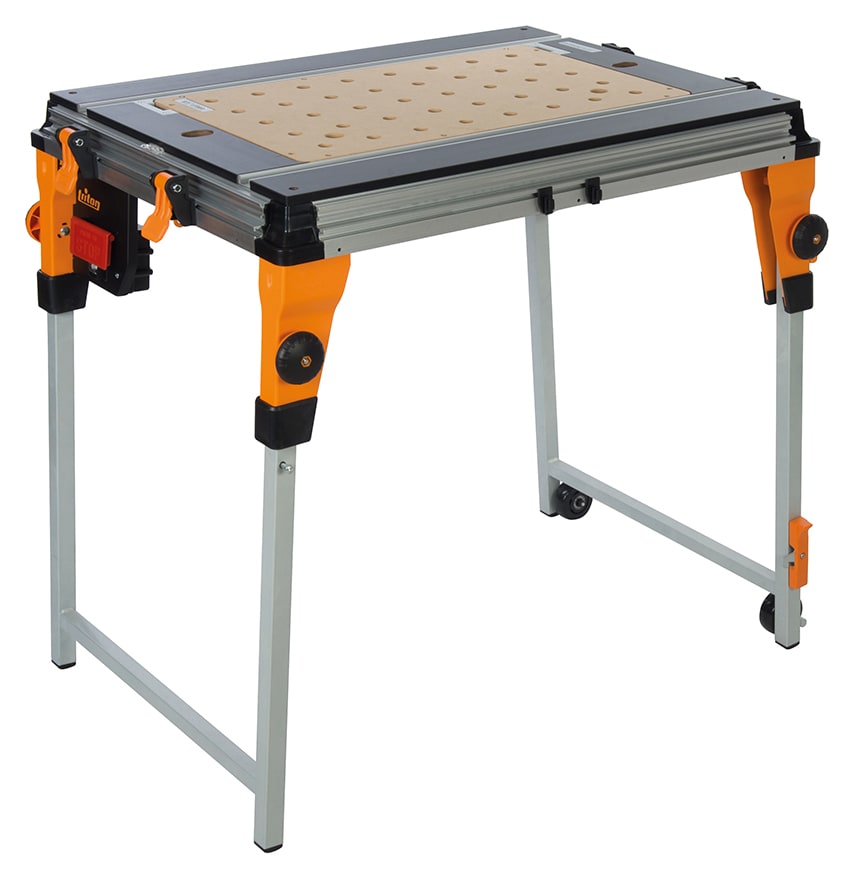 The Triton TWX7 Multifunction Workcentre is a versatile woodworking station with a multitude of accessories for tackling any woodworking task. Built-in mains isolated switch connector for connecting power tools, with knee-off stop button function. Includes clamping table module with 40 x 20mm dia holes for securing workpieces. Easy-to-fit module inserts quickly transform the workcentre into the tool desired by the operator. Module levelling screws for simple surface level calibration result in a perfectly flat work surface. Positioning wheels improve manoeuvrability, for small position adjustments. Folds down compactly for convenient transportation. Accessories available include router module, side support, outfeed support, rugged transit kit, rugged transit wheels, protractor assembly, rugged transit handle and saw table module.