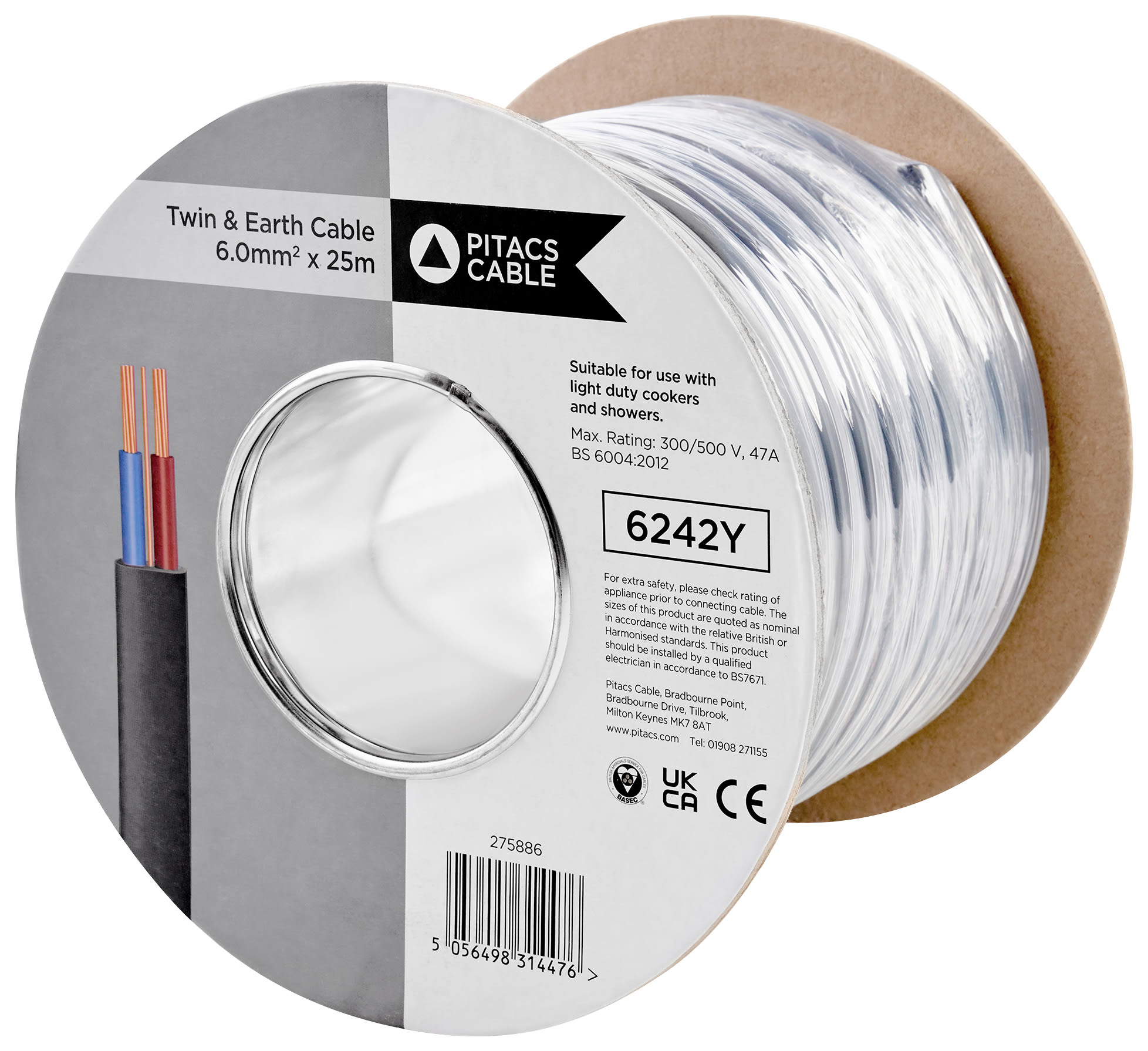 The Twin and Earth 6242Y Cable can be installed in fixed installations in dry or damp premises clipped to surface, on trays or in free air where mechanical damage would not be an issue. Suitable for laying in conduit or trunking where mechanical protection is required. With a thickness of 6.0mm2, this cable is designed for reliable power distribution in various applications. The grey color signifies its use as a twin and earth cable, offering both live and neutral conductors alongside an earth conductor for enhanced safety.