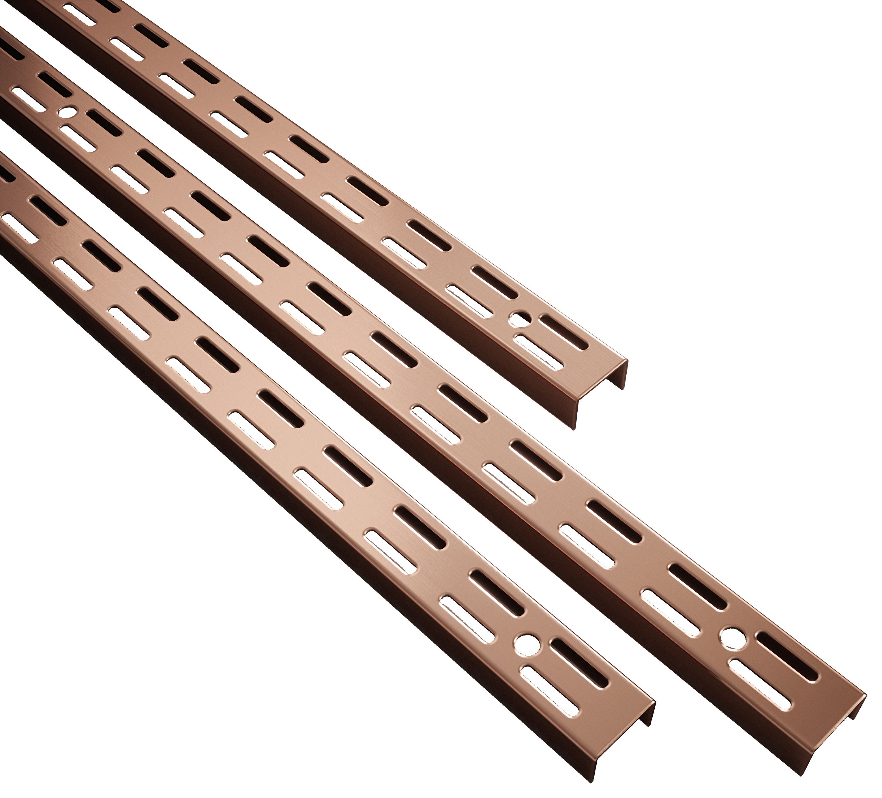 The antique copper twin slot system offers a space saving alternative to freestanding shelving units. Uprights are fixed directly to the wall with slots positioned 32mm apart which allows the brackets to be positioned at heights of your choice. Manufactured from steel to prevent splitting or bending when under load. Recommended for masonry walls. Uprights are available in a variety of lengths depending on the desired size of your system.