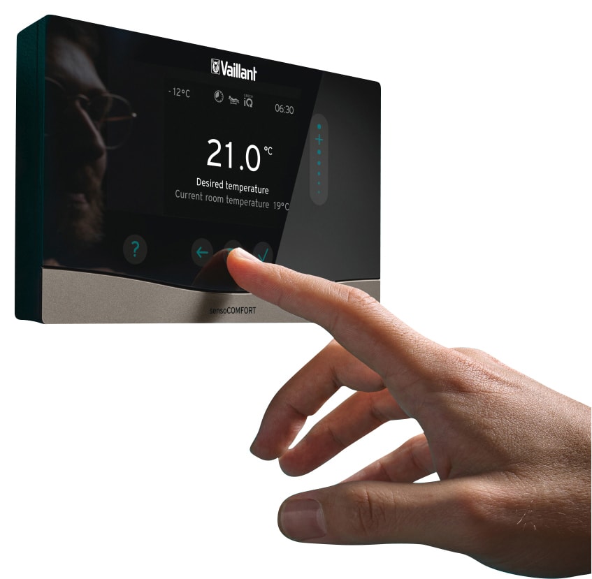 The Vaillant SensoCOMFORT Thermostat has been designed to be simple to install and use, and operates with Vaillant’s proprietary eBUS protocol. This ensures all the components of the system can easily communicate with each other to provide optimum system performance. It’s perfect for multi-zone gas-fuelled systems, and hybrid or renewable installations.