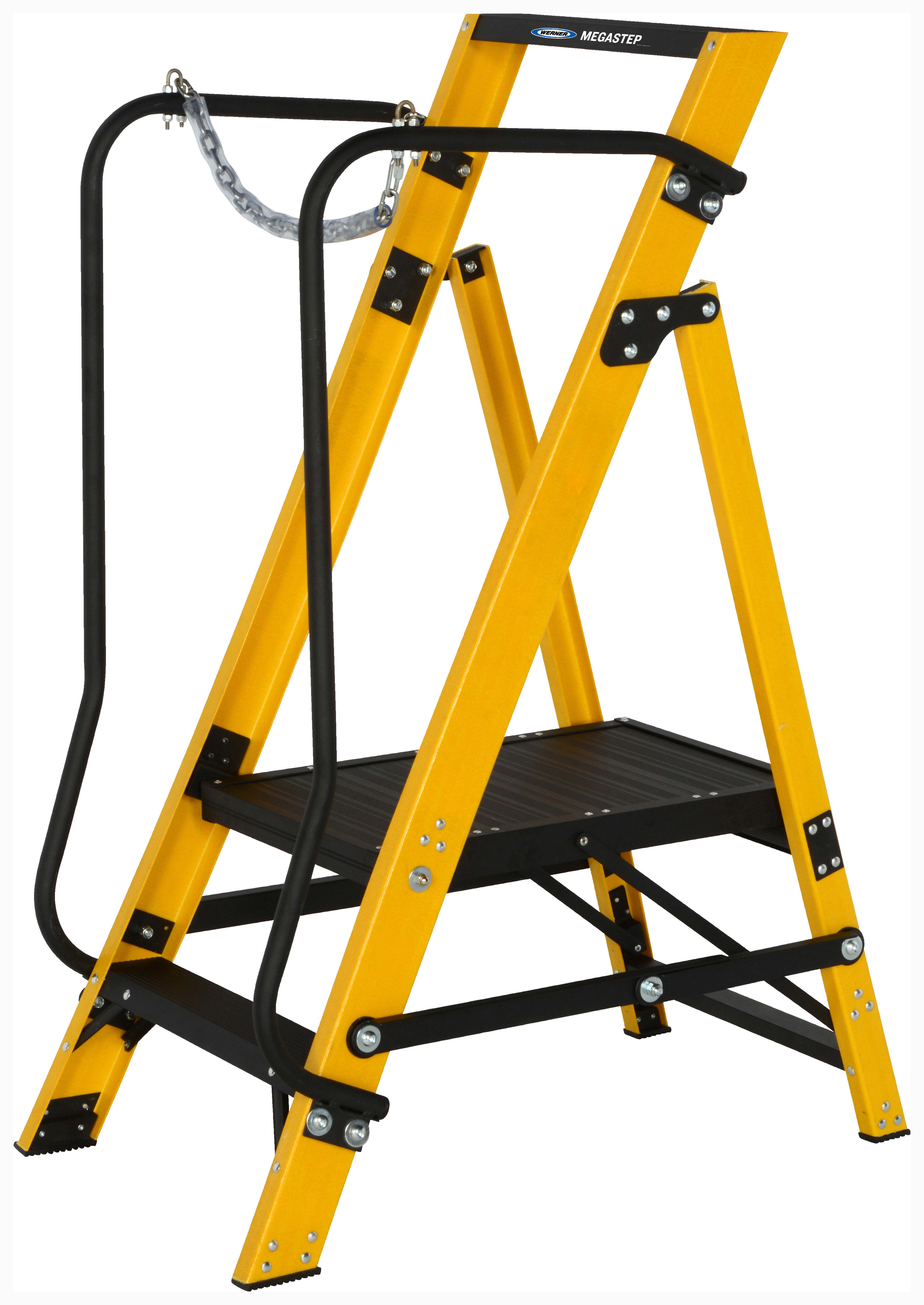 The 2 tread Megastep is constructed using durable, non-conductive, fibreglass rails that are highly resistant to weathering. This fibreglass ladder includes twin handrails and a safety chain to enable 360° protection when working on the platform.