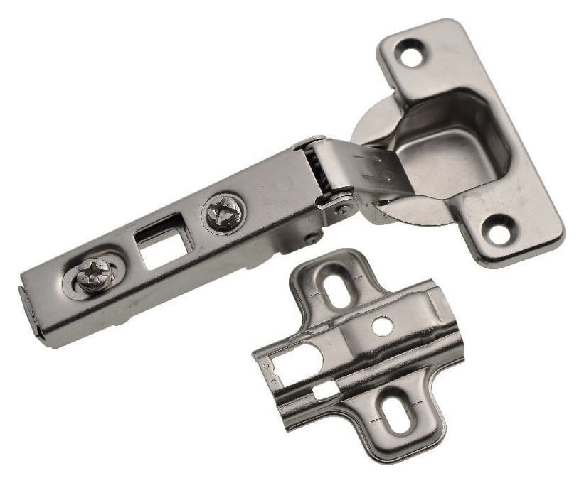 Easy to install cupboard door hinge for concealed fitting. This is clip on sprung hinge with 110 degree opening in high quality nickel plating. Comes as pack of 6.