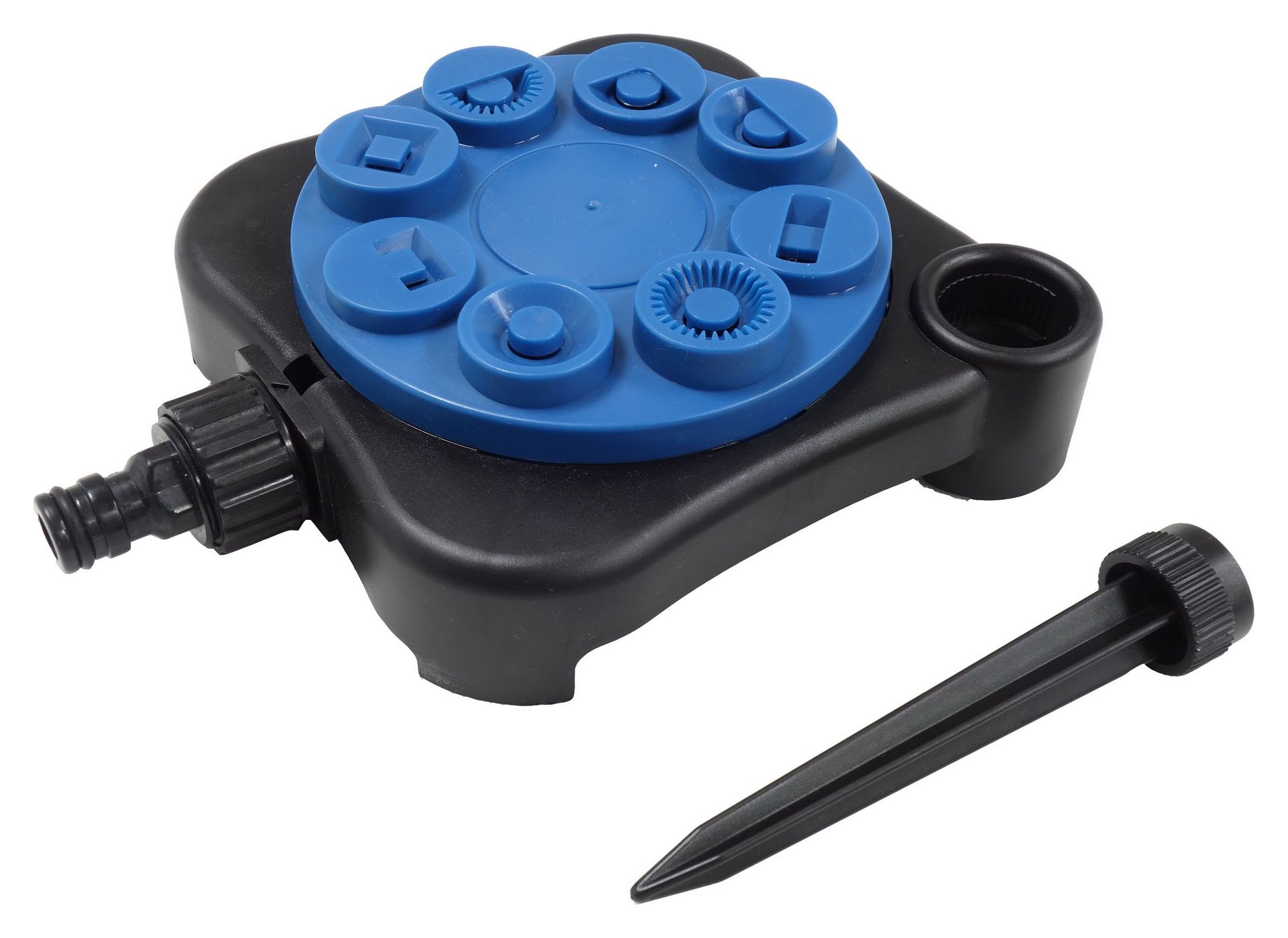 This 8 Pattern Water Sprinkler connects to standard 1/2 inch fittings and hoses and suits small to medium sized gardens. Complete with a sturdy spike, the sprinkler operates with 8 different patterns per your desire.