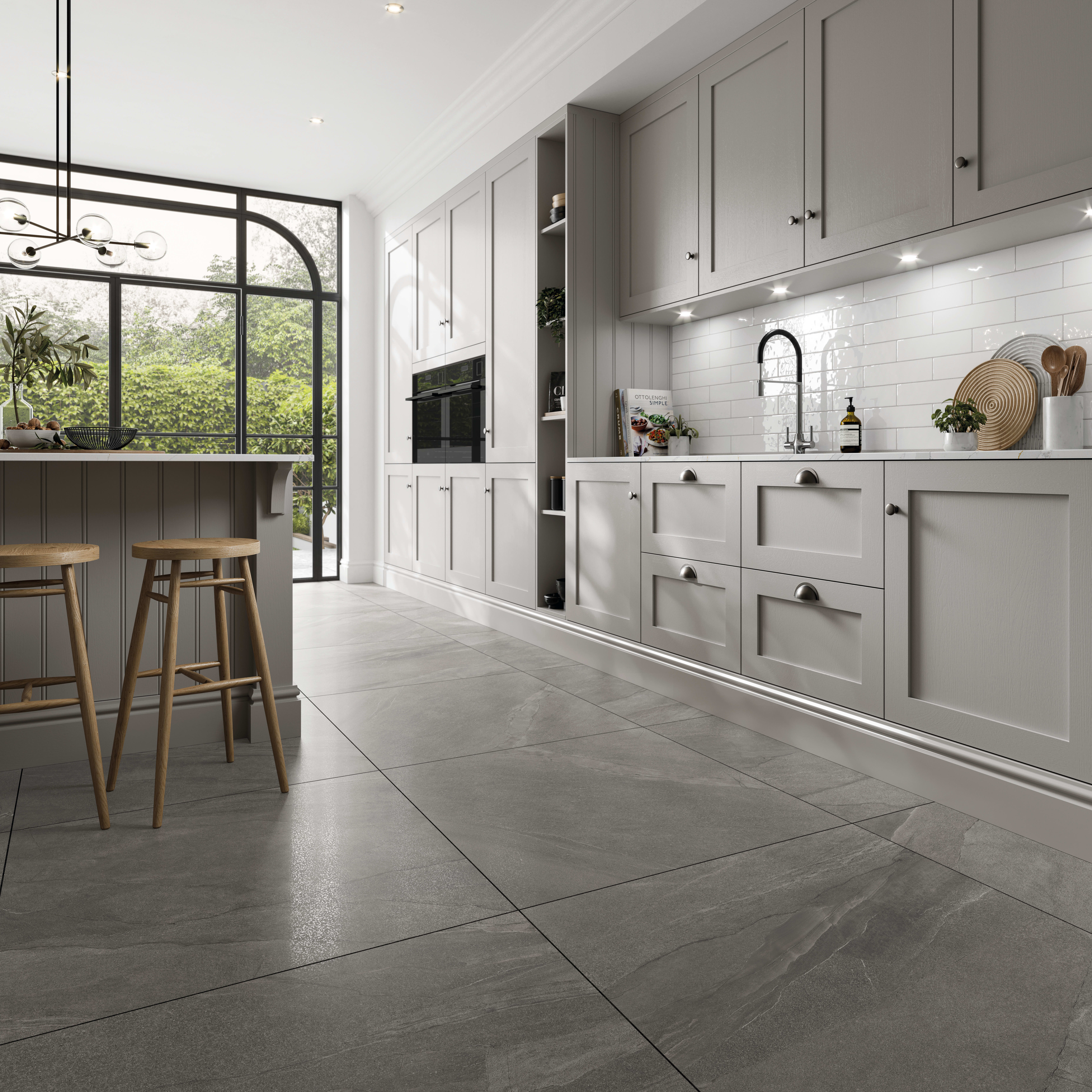 The Boutique Foundry Graphite Lappato Polished Porcelain Wall and Floor Tile is a classic, premium natural stone effect tile with a semi-polished finish. This hard wearing porcelain tile has a subtle riven texture to replicate the finish of natural stone. Great in hallways and kitchens, this beautiful tile adds elegance to any room.