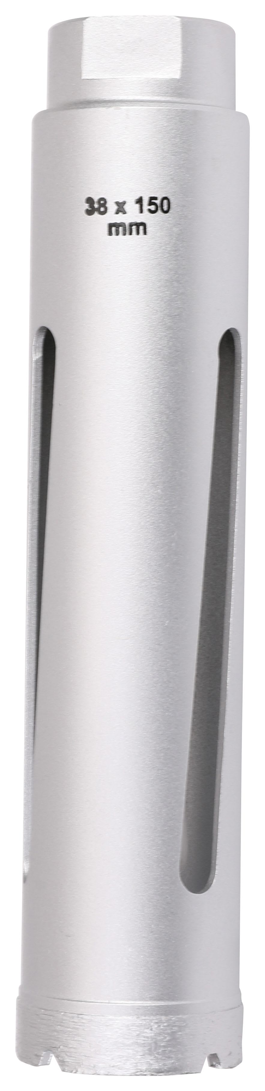 This Wickes 38mmØ x 150mm length diamond core drill bit is a professional quality core bit with sintered diamond cutting edges for cutting through masonry and brick and features large vents for fast waste removal and a longer lasting life span.