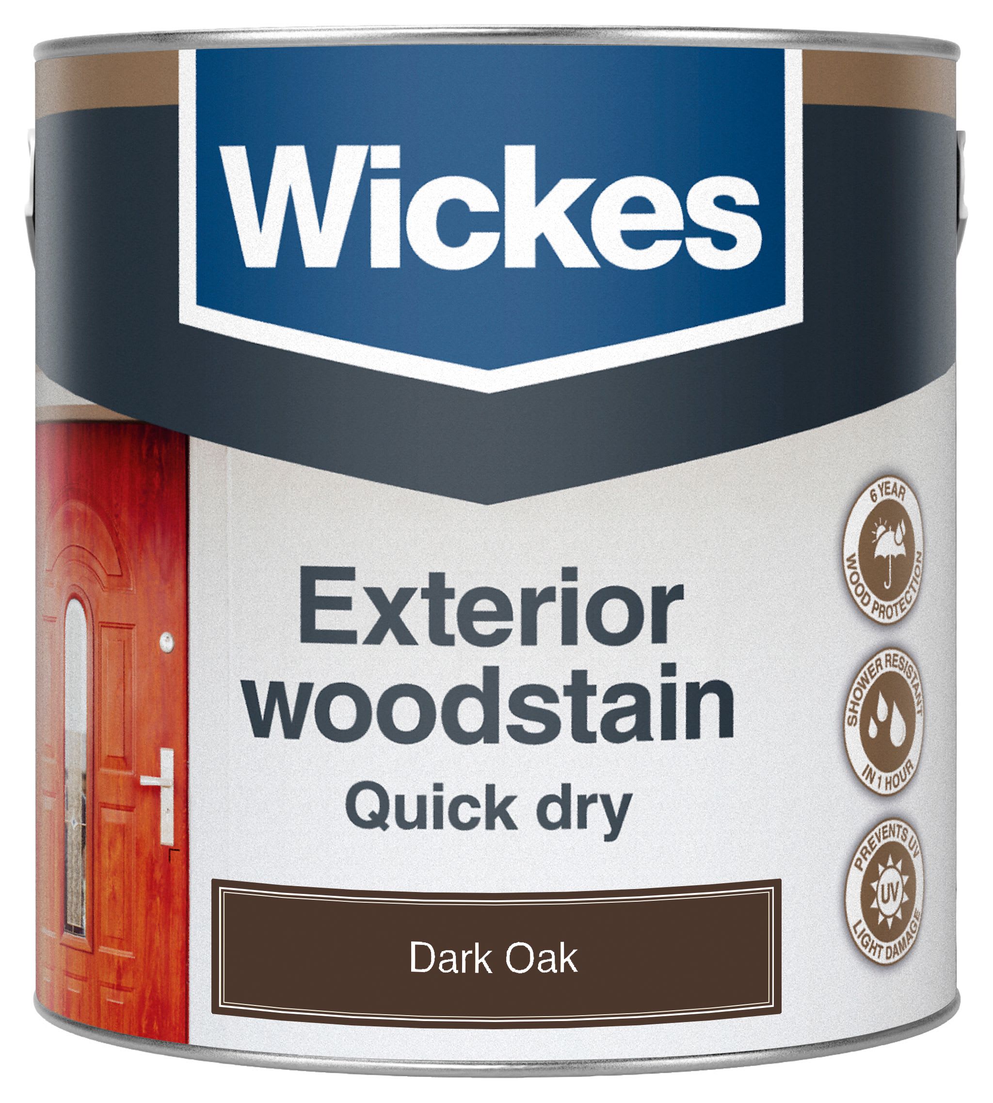 The Wickes Exterior Quick Dry Woodstain in the shade Dark Oak is formulated to provide a durable semi-transparent coloured finish. It will help prevent damage to wood by UV light and allows the natural wood grain to show through. This quick dry woodstain formulation resists peeling and flaking and is rain proof in just 1 hour.