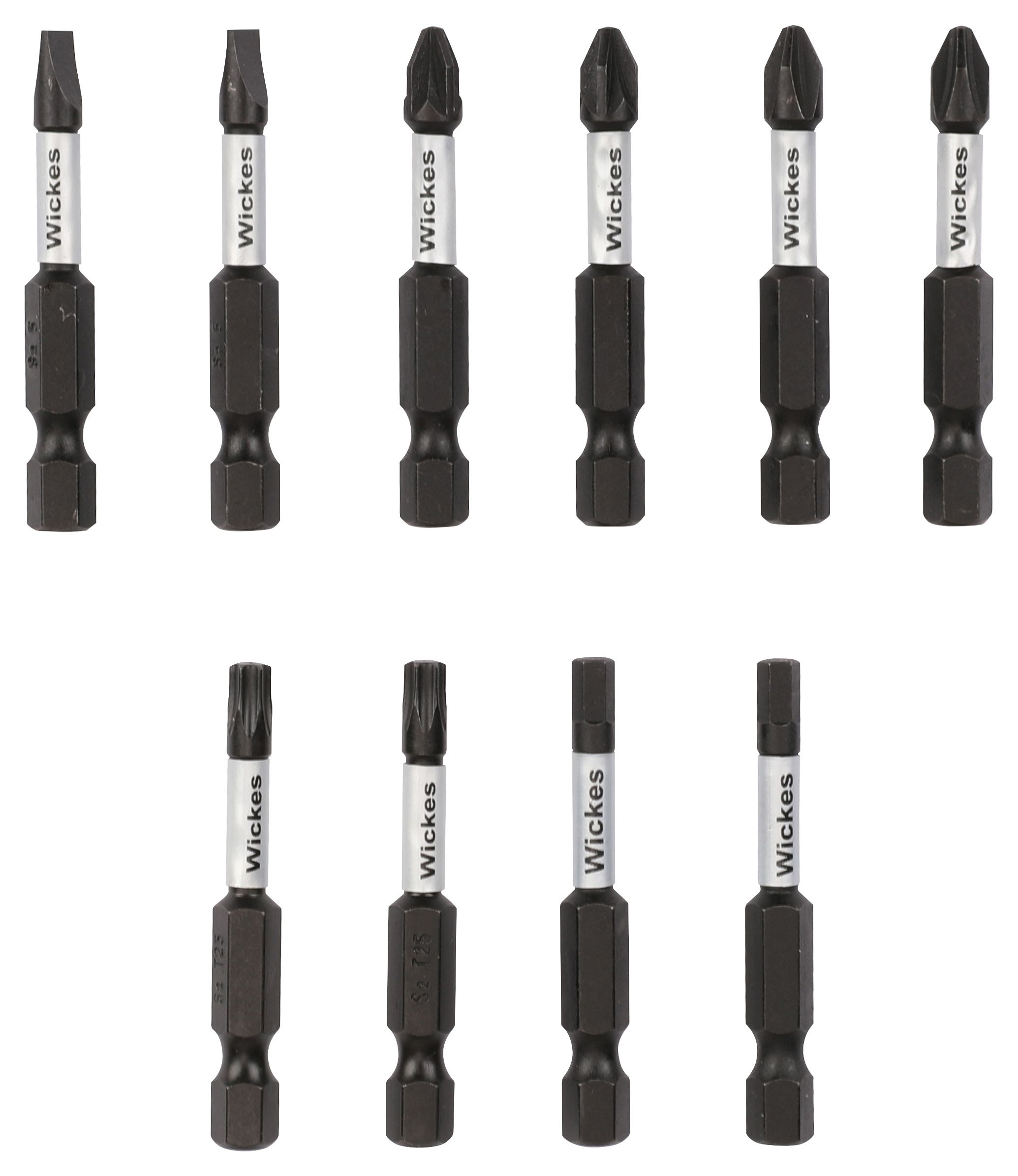This Wickes 10 piece 50mm mixed impact screwdriver bit set is made of heat-treated S2 grade steel for greater hardness and longer service life; Ideal for for professional and DIY use.