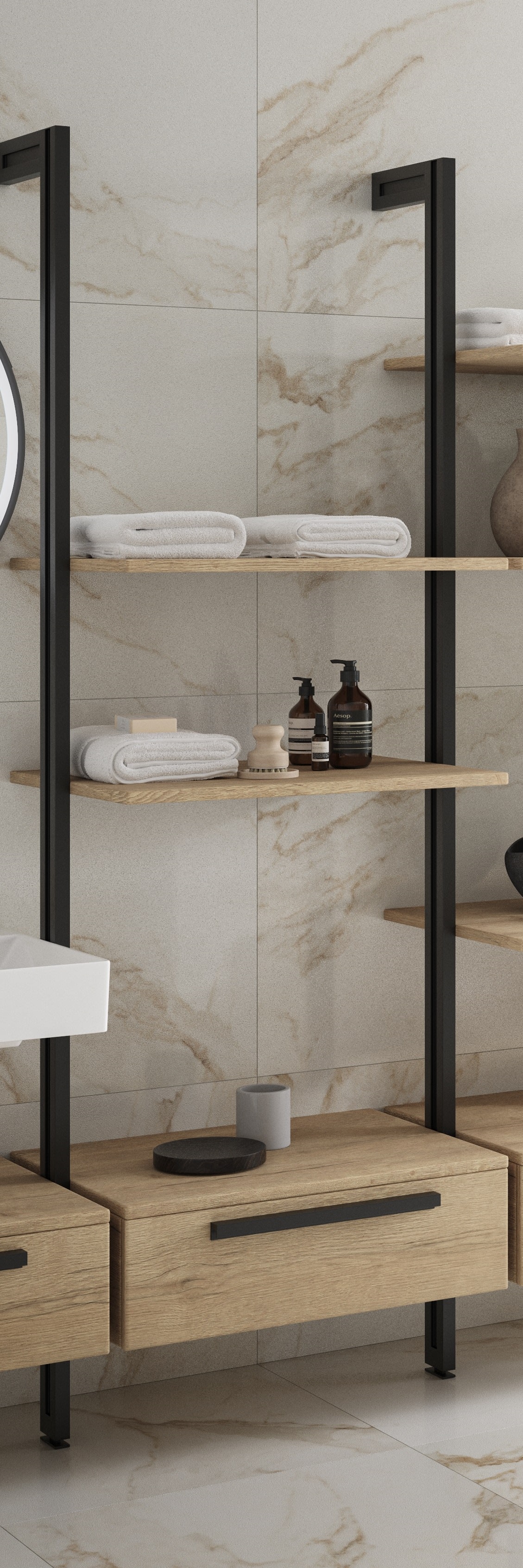 The innovative Rimini modular structure is meticulously crafted to transform your bathroom into a personalised haven. This Rimini modular system is a shelving unit; perfect stotage for your bathroom and can also be adapted for other areas of the home. The unique design of the modular system empowers you to tailor the space to your exact specifications, offering full height adjustability and flexible length options. Elevate your bathroom experience with the adaptability and customisation that the Rimini modular system brings. Giving you a space that is uniquely and distinctly yours.