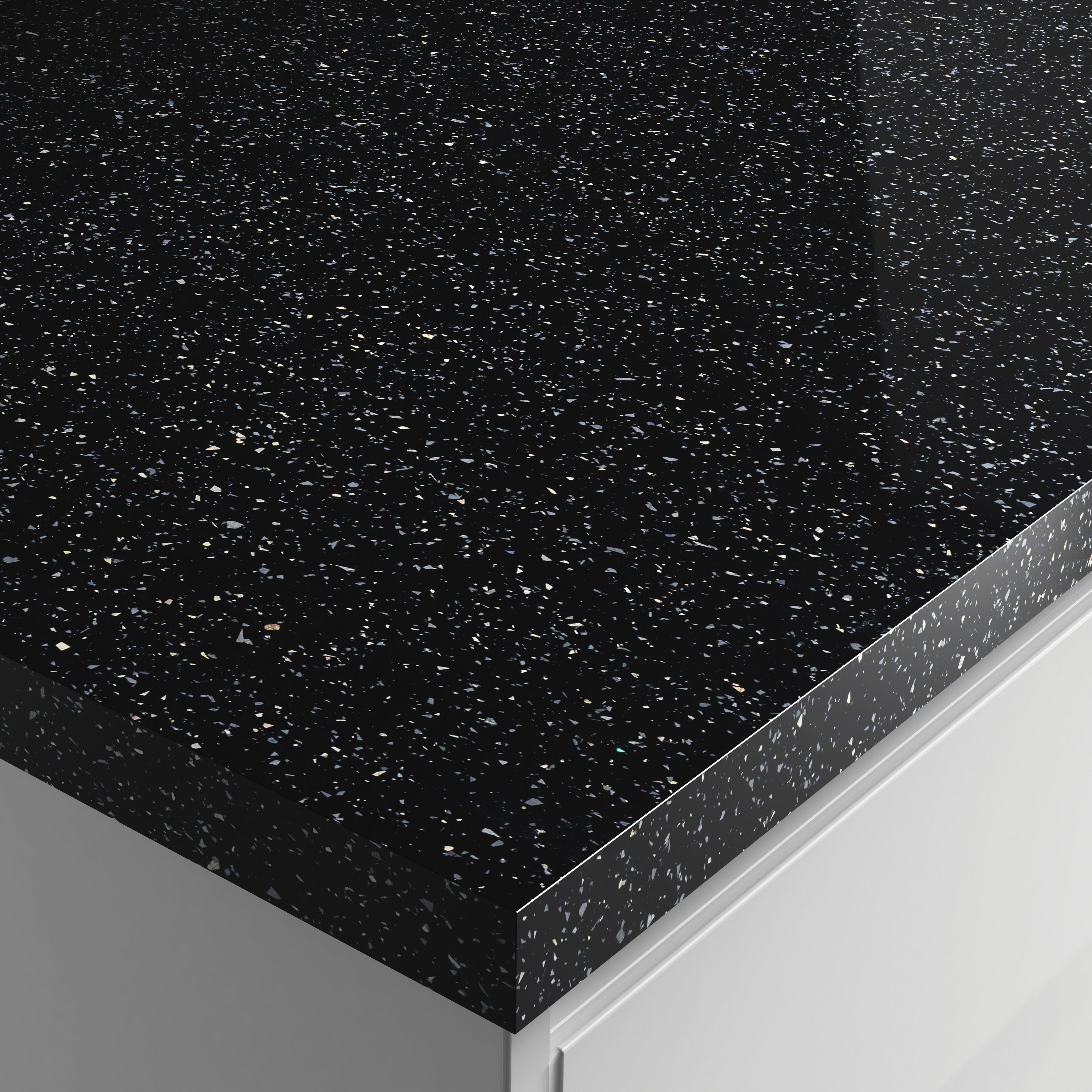 High gloss black laminate with luxurious sparkles creating the look and feel of quartz.