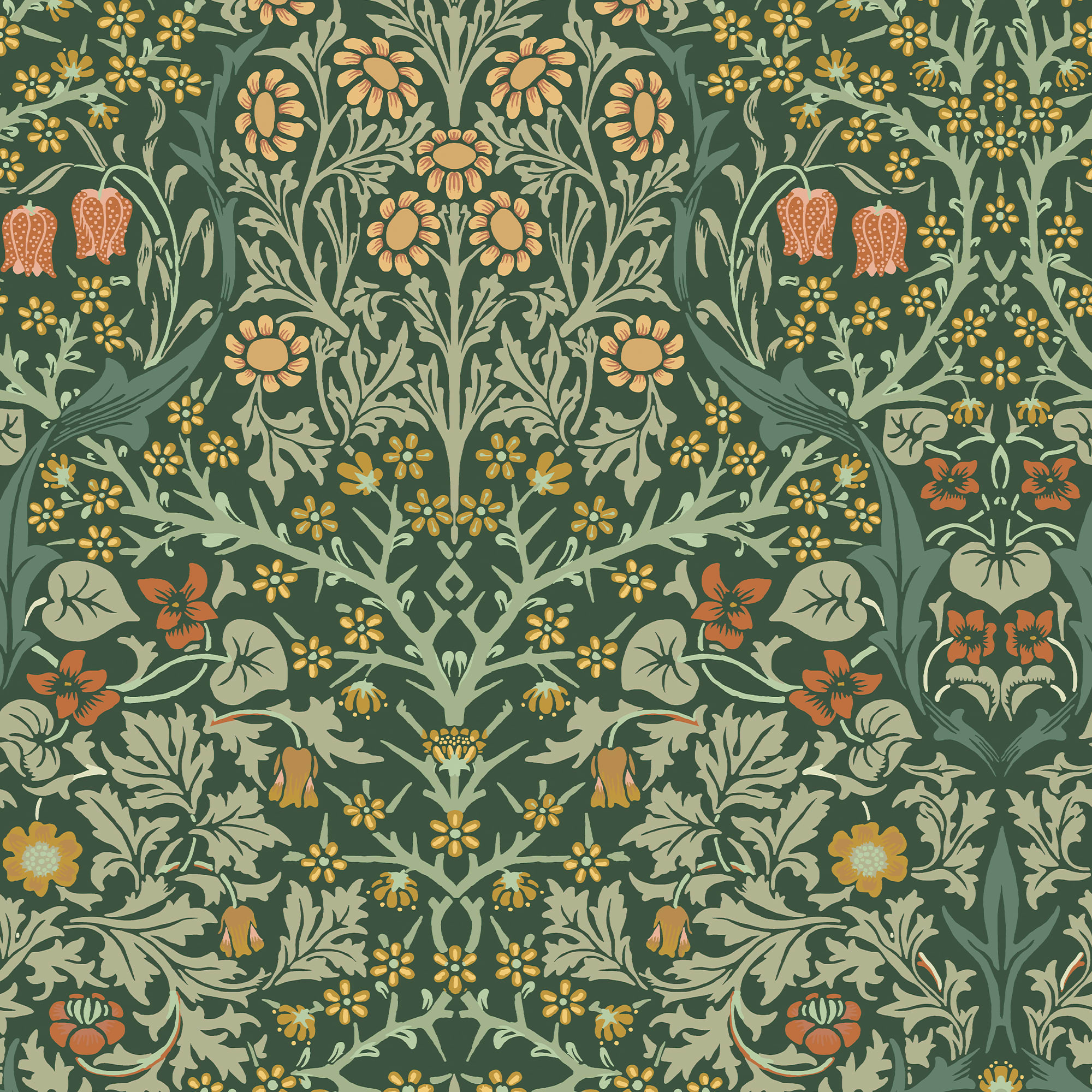 Designed in 1892, Blackthorn was originally block-printed and features white blackthorn (or sloe) blossom and violets with meadow flowers of red snakes head fritillaries and yellow daisies. The flowers bloom from a lattice of curling foliage, leaves, and stems in this iconic Morris pattern. Typical of Morris’ work, Blackthorn is a celebration of the beauty of nature. Blackthorn Deep Green features both mustard and pastel yellow, alongside multi-tonal green vines, accented by pops of pink, all laid upon a deep green backdrop. This wallpaper comes in a matt finish for a luxurious look and feel.