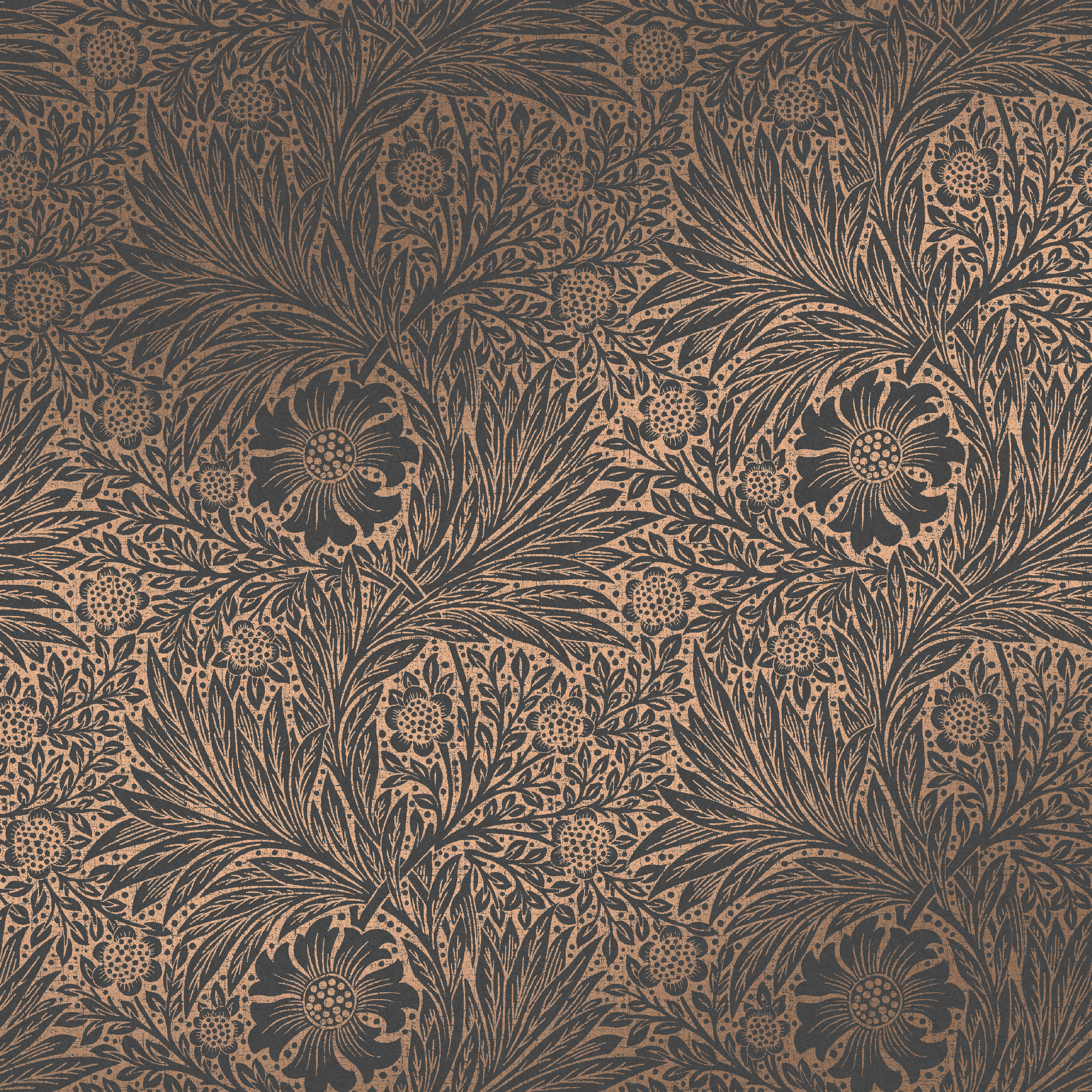 Marigold was designed by William Morris and registered as a wallpaper in 1875. The pattern incorporates larger marigold flowers amongst sprays of willow like leaves, on a sub-pattern of smaller foliage and flowers. The monochrome pattern was produced in a wide variety of colourways. Morris also registered the design as a printed cotton later in 1875, one of only three designs Morris specifically intended to be produced as both a textile and a wallpaper. Marigold Fibrous Charcoal displays Morris' famous design on a textured, matt charcoal paper beautifully detailed with a copper metallic print, adding an eye-catching element to this dark toned wallpaper, making this the perfect choice for a sophisticated feel.