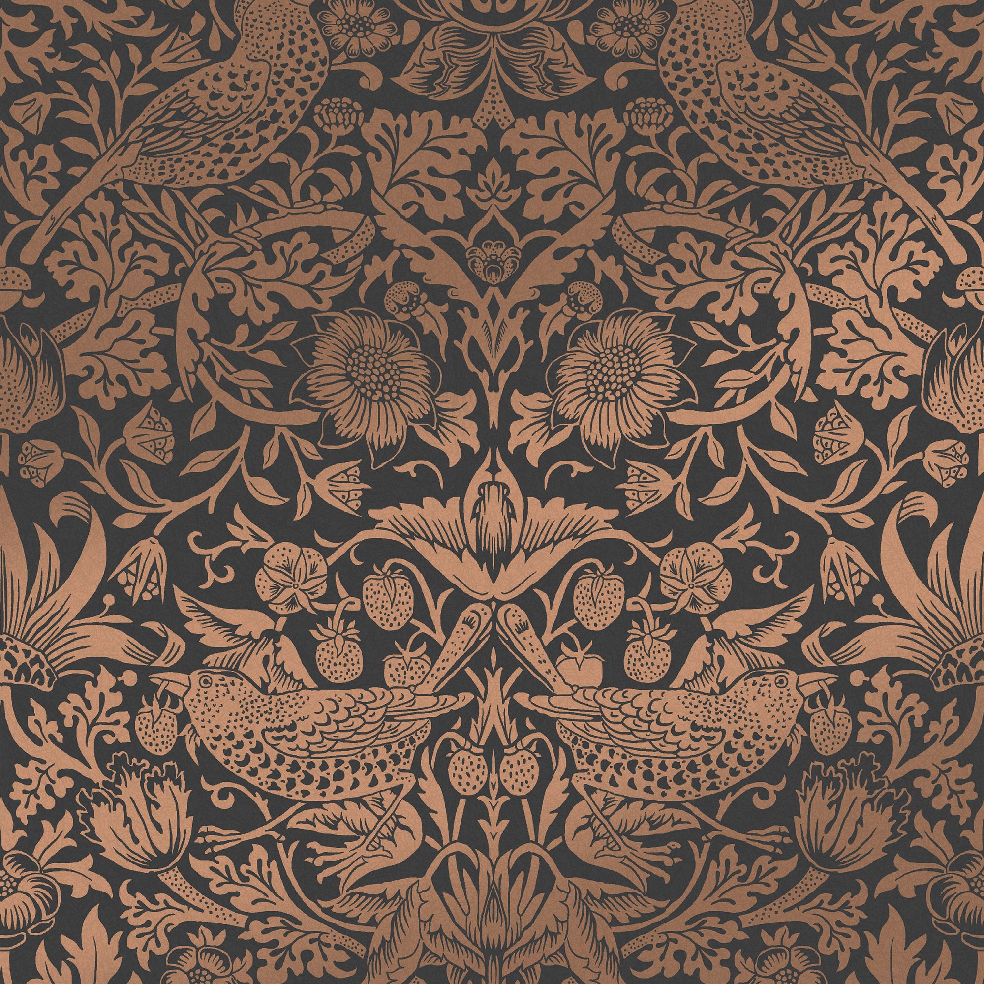Perhaps William Morris’s most recognisable design, Strawberry Thief was inspired by the thrushes that crept under Morris’s strawberry nets in his garden at Kelmscott Manor, Oxfordshire. The original pattern took several days to print using hand-carved woodblocks to build up the different colours, and ‘Strawberry Thief’ was consequently one of Morris’s firm’s most expensive cottons. Whilst waiting to see the first piece printed, Morris endured sleepless nights in his lodgings at Merton Abbey. Designed in 1883, Strawberry Thief remains one of William Morris’s most popular and iconic designs. Strawberry Thief Fibrous Charcoal presents Morris' famous design in a beautiful metallic copper print, giving texture and intrigue. Complimenting the textured, matt charcoal background of this wallpaper.