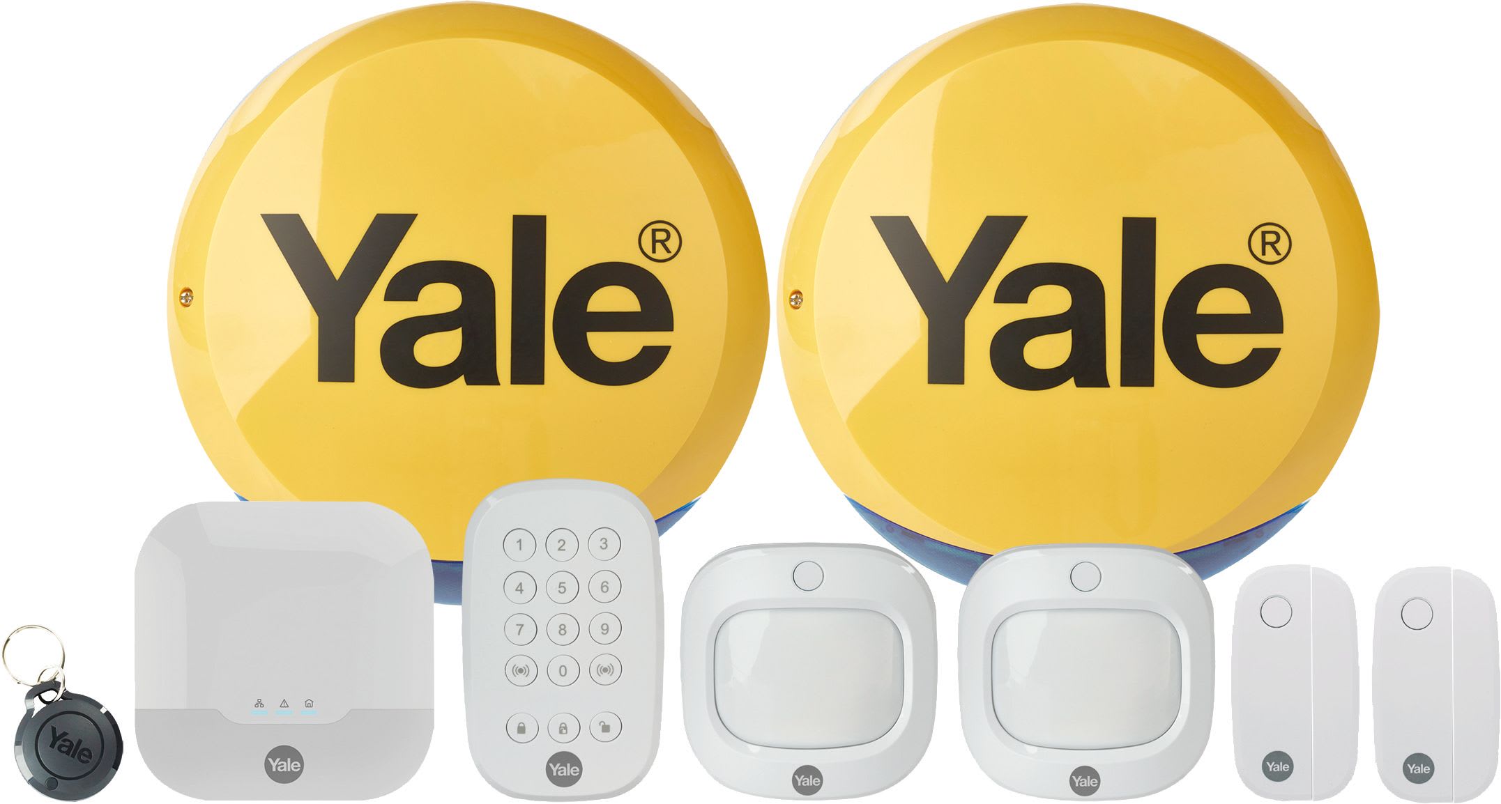 • Product includes: 1 x sync hub, 1 x live siren, 1 x dummy siren, 2 x motion detectors, 1 x keypad, 2 x window / door contact and 1 x key fob