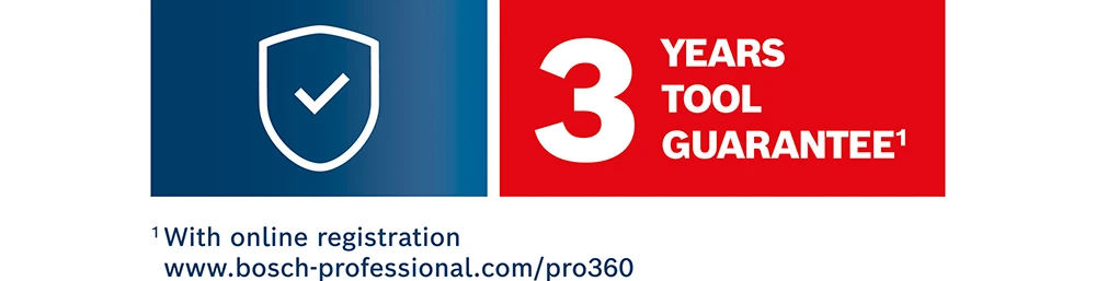 The term of the guarantee runtime starts on the date of purchase. More information can be found in the relevant guarantee conditions or terms and conditions of participation. Register each of your tools individually within four weeks of purchase using the PRO360 service portal. www.boschpro360.co.uk or PRO360 app. You will then receive a certificate with all key information.