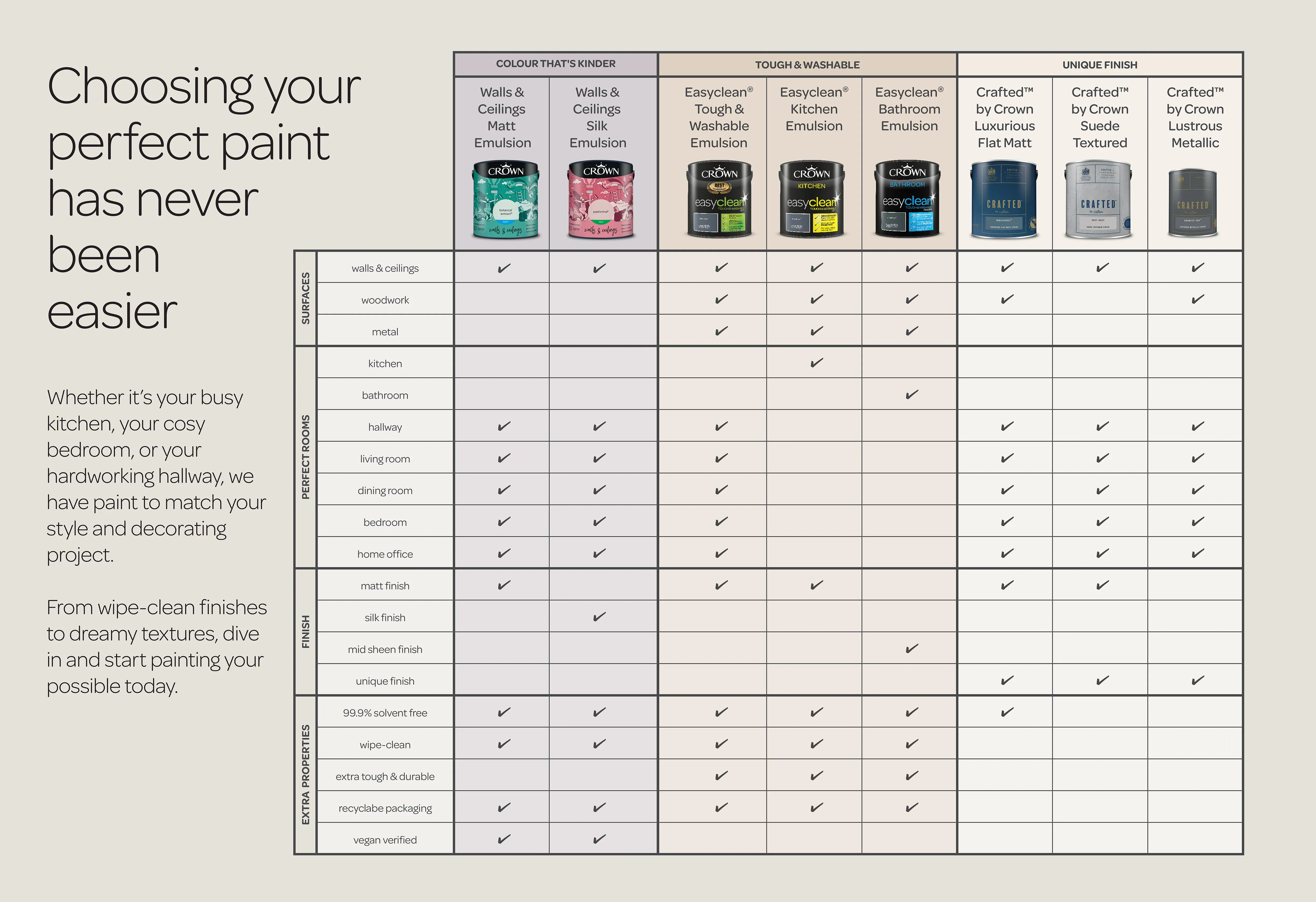 Say a big, bold hello to Crown! We’ve got eighty gorgeous shades ready to roll, including twelve brand new colours and six shades that are all bang on trend. Whether you’re all about calm neutrals or wild pops of “wow”, we’ve got a shade (or three) with your name on it. Our paints are must than just a pretty colour, they’re long-lasting, have great coverage, and are a dream to apply.