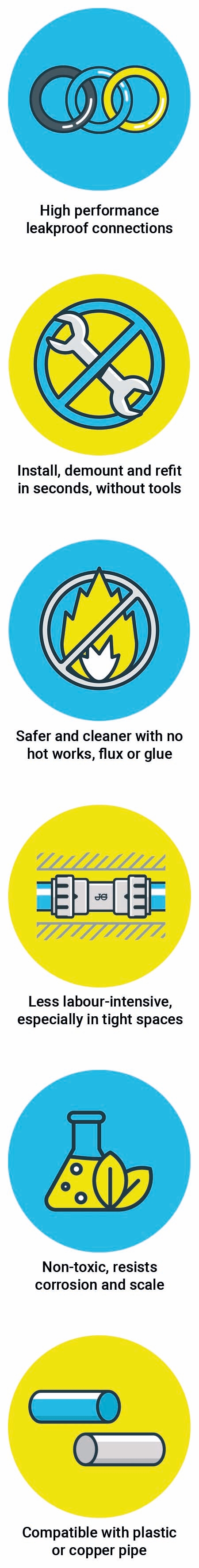 Get fast and leak-tight connections every time, with JG Speedfit's easy to install push-fit plumbing and heating system. Using a unique blend of push-fit and multi-seal technology, Speedfit can be installed and demounted in seconds without the need for tools or hot works.