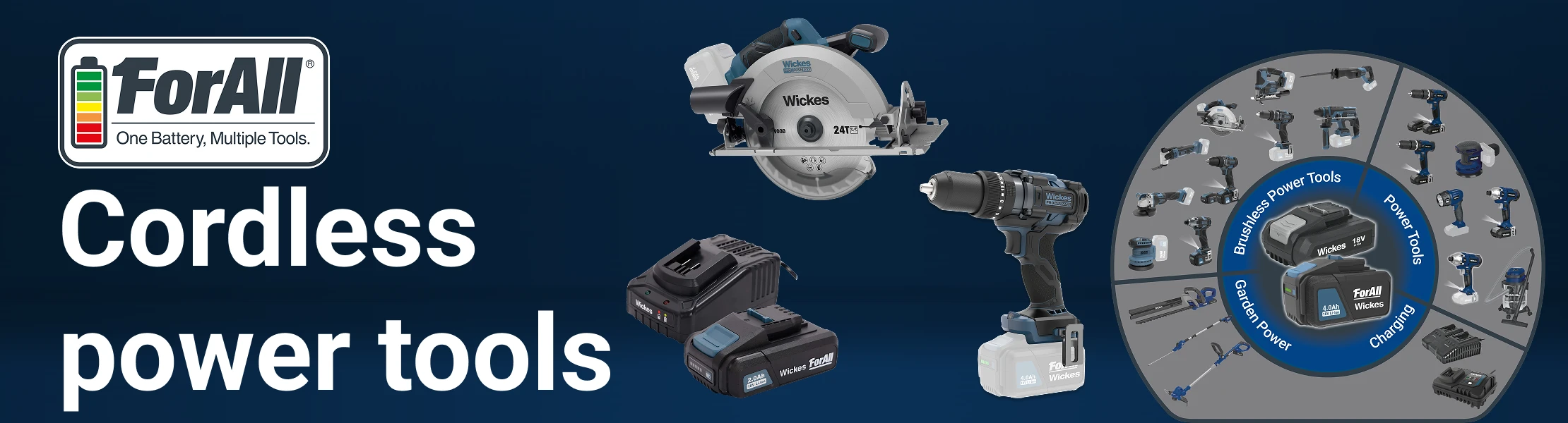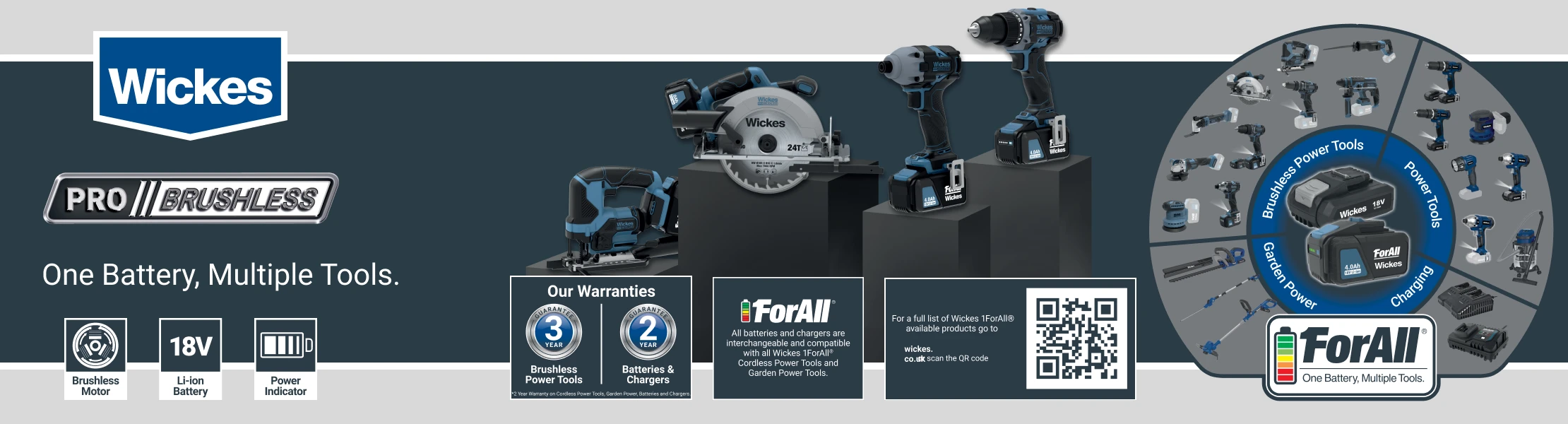 We are proud to introduce our new Wickes brand of Professional Brushless Power Tools range. This range offers quality specification and value with the latest developments in technology matched with durable design to produce tools to last. Our new Brushless range is designed to meet the needs of key Trade projects. In our Cordless 18V range our batteries are compatible and interchangeable with all 1ForAll(R) Wickes Cordless Power Tools and Wickes Cordless Garden Power Tools. Our new Brushless range has brushless motor technology that gives you the extra power, torque and runtime. Our DIY range offers superb value that meets needs of DIY projects.